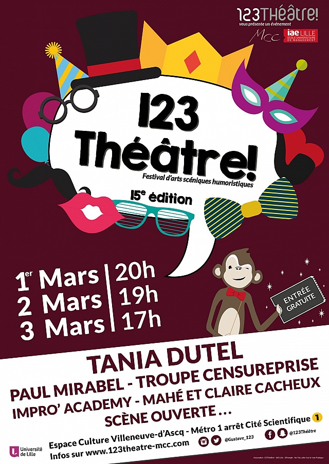 La 15ème édition du festival 123 Théâtre ! aura lieu du 1er au 3 mars 2019 à l'Espace Culture de Villeneuve-d'Ascq.